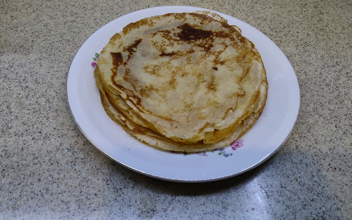 - На 2 стакана пшеничной муки - 1 столовая ложка сахарного песка, 3 стакана молока, 1 яйцо, 1/2 чайной ложки соли, растительное масло для жарения.