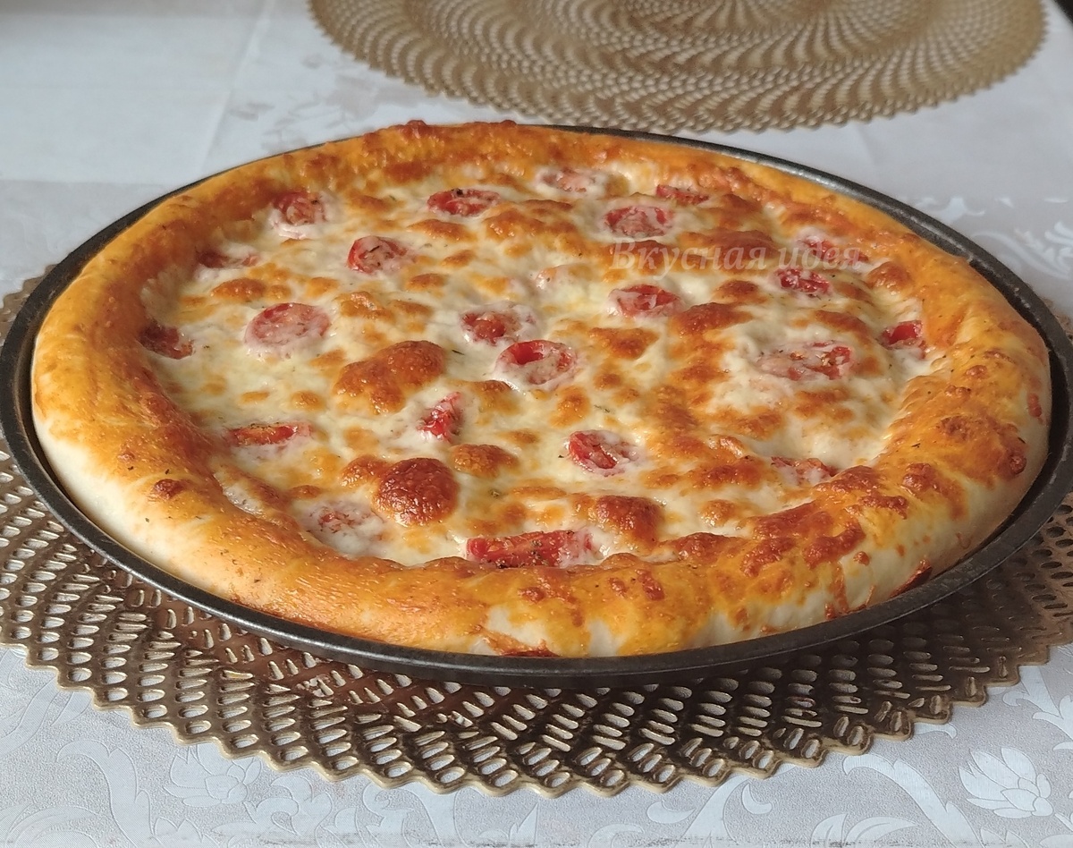 Пиццу давно уже не покупаю, а готовлю дома, это просто, вкусно и доступно! С таким тестом легко работать, оно мягкое и эластичное. С начинками можно пофантазировать, добавить Ваши любимые ингредиенты. Рецепт: Вода тёплая 200 мл. Дрожжи сухие 1 ч.л. Сахар 1 ч.л. Соль 0,5 ч.л. Масло оливковое (подсолнечное) 2 ст.л. Мука 350 гр. Начинка: Томатный соус 3 ст.л. Сыр моцарелла 200 гр. Помидоры черри 6 - 7 штук Приготовление: В тёплой воде растворите дрожжи и сахар, оставьте на 10 минут. Смешайте муку с солью, добавьте дрожжевую смесь и масло. Замесите мягкое тесто и оставьте его на 1,5 часа. Тесто можно поделить на две части, а можно не делить и сделать одну большую пиццу, у меня 35 см. Растягиваем тесто до размера формы. Смажьте основу томатным соусом, сверху посыпьте крупно натертой моцареллой. Помидоры черри разрежьте пополам и разложите. Выпекайте при 230° духовке 10 - 12 минут. Приятного аппетита!