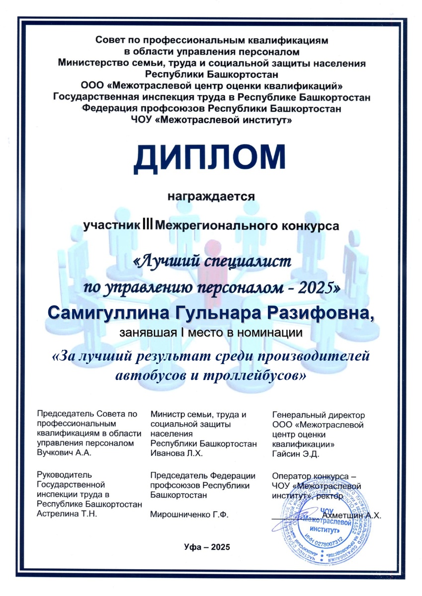 Начальник отдела кадров ПАО «НЕФАЗ» Гульнара Самигуллина подтвердила высокий уровень компетенции на III Межрегиональном конкурсе «Лучший специалист по управлению персоналом – 2025». Она заняла первое место в номинации «За лучший результат среди производителей автобусов и троллейбусов» и четвертое место среди 328 специалистов в области управления персоналом со всей страны, войдя в рейтинг «10 лучших специалистов по управлению персоналом России – 2025». Данный конкурс прошел 6 февраля в Башкирском межотраслевом институте. Его организаторами выступили Совет по профессиональным квалификациям в области управления персоналом (г. Москва), Министерство семьи, труда и социальной защиты населения Республики Башкортостан, Государственная инспекция труда в Республике Башкортостан, Федерация профсоюзов Республики Башкортостан, ООО «Межотраслевой центр оценки квалификаций» и ЧОУ «Межотраслевой институт». Конкурс проводился дистанционно в формате онлайн-тестирования. Каждый участник должен был ответи