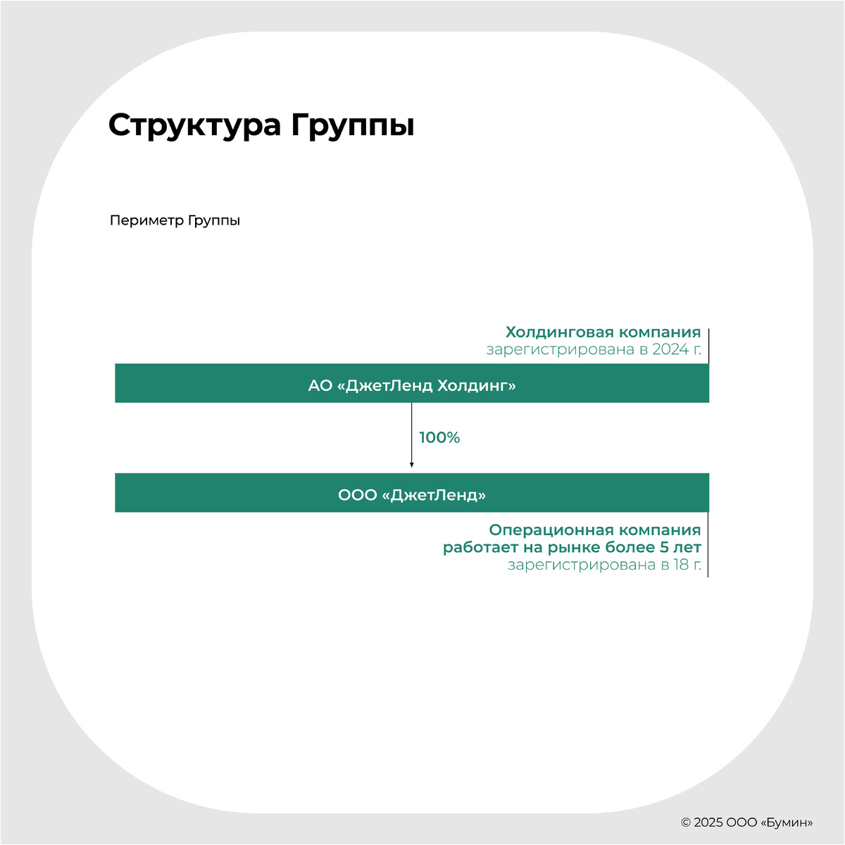 Группа «ДжетЛенд» представлена двумя компаниями: АО «ДжетЛенд Холдинг» (материнская) и ООО «ДжетЛенд» (дочерняя). Основателями Группы являются Роман Хорошев и Евгений Усков и через структуры, расположенные в Гонконге, владеют долями в уставном капитале АО «ДжетЛенд Холдинг» по 39.05% и 23.40%, соответственно. На миноритарных акционеров, участвовавших в более ранних инвестиционных раундах, и сотрудников Компании приходится 31.91%.