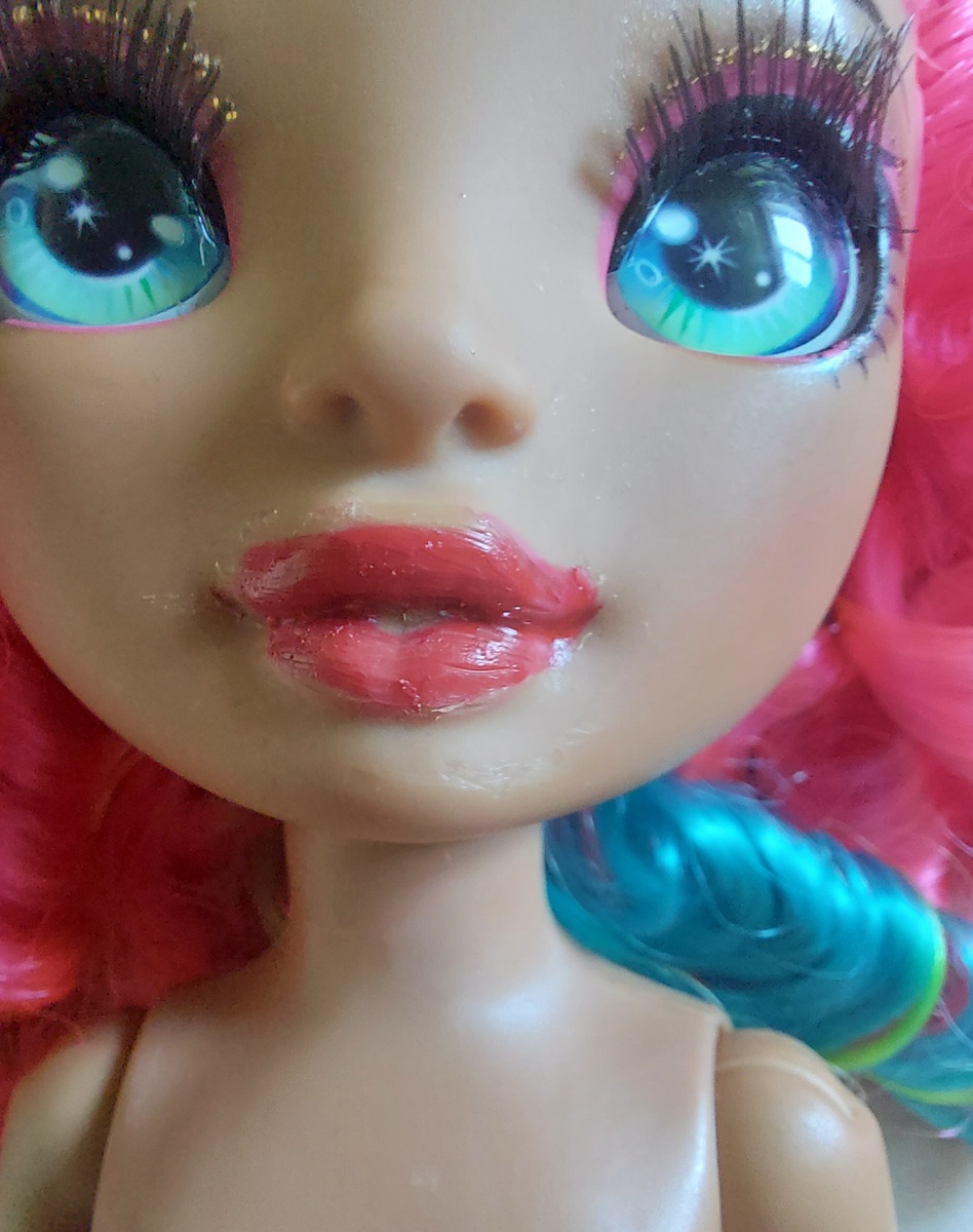 Сначала я думала просто покрыть лаком губы куклы и оставить как финальный вариант. Но уже при нанесении поняла, что повреждения, хоть и не такие значительные, есть и вокруг губ тоже. Если я просто все закрашу, то они будут видны намного сильнее. Так что вокруг губ гель-лак я тоже нанесла.
