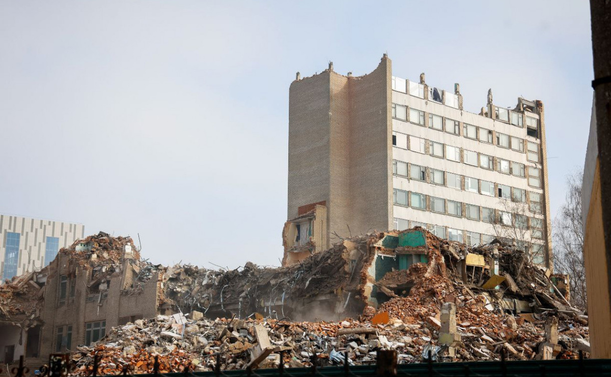 На Энгельса продолжают сносить 12-этажное здание бывшей типографии: фоторепортаж и видео
