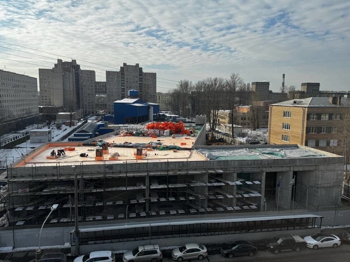 На строительной площадке вестибюля станции «Путиловская» идут работы по обустройству кровли