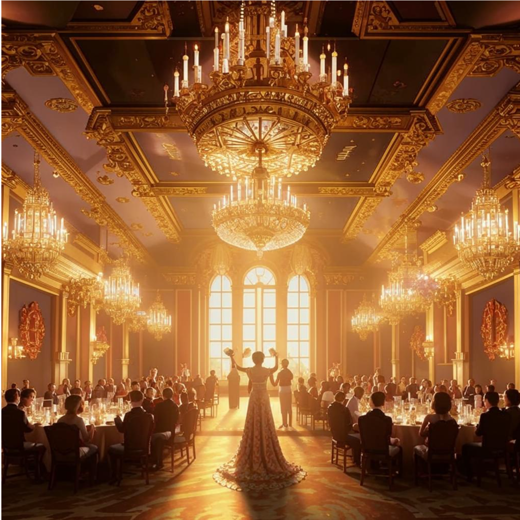 Сам зал полыхал роскошью: хрусталь сверкал, шелковые драпировки колыхались, золотые узоры на стенах переливались. Гости, ослепительные в своих нарядах, шушукались, обмениваясь светскими фразами. Оркестр играл торжественную музыку. И вот дверь приотворилась, настало время для торжественного ритуала объявление гостей глашатаем.