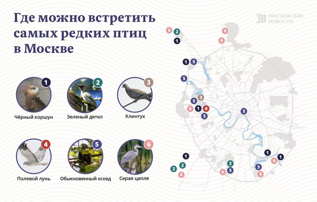 Горожане стали больше и регулярнее кормить птиц, стали появляться стихийные кормовые зоны, сообщил орнитолог Вадим Мишин. В том числе поэтому в Москве стало больше дятлов (пестрый, черный). Стали появляться экзотические утки, например мандаринки. Есть разнообразие и среди водоплавающих чомг. Из певчих птиц это преимущественно синицы: большая, лазоревка, московка, пухляк, гаичка.