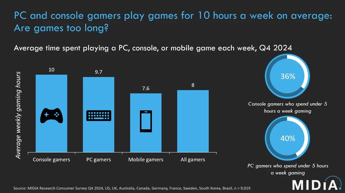 Исследование Midia Research показало, что современные геймеры все реже уделяют время видеоиграм. В среднем консольные игроки тратят 10 часов в неделю, а пользователи ПК — 9,7 часа. При этом 36% консольных геймеров и 40% игроков на ПК играют менее 5 часов еженедельно. Основной причиной сокращения игрового времени стала конкуренция с другими цифровыми развлечениями, такими как TikTok, YouTube и Netflix. В отличие от игр, требующих глубокого погружения и длительного участия, просмотр коротких роликов или сериалов проще вписать в плотный график. Кроме того, AAA-игры часто требуют более много времени для прохождения, что отпугивает людей. Это также снижает интерес к подписочным сервисам вроде Game Pass и PlayStation Plus, где пользователи не успевают исследовать весь доступный ассортимент. Эксперты Midia Research рекомендуют разработчикам создавать более короткие и компактные игры. Такой подход снизит затраты на производство и сделает проекты привлекательнее для аудитории, ценящей быстрые,