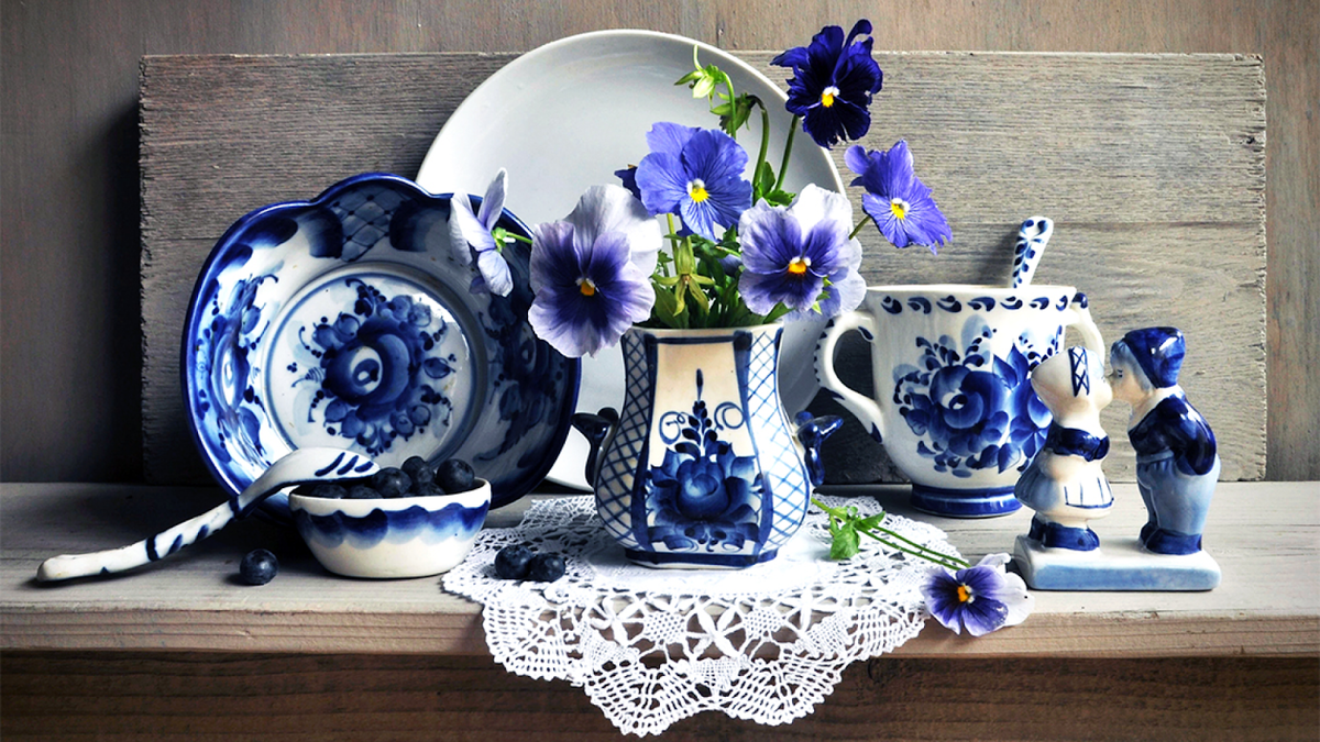 Гжель — изысканные вазы, чашки и тарелки с росписью. Ими можно всегда отлично украсить праздничный стол и использовать, например, для чайных церемоний.