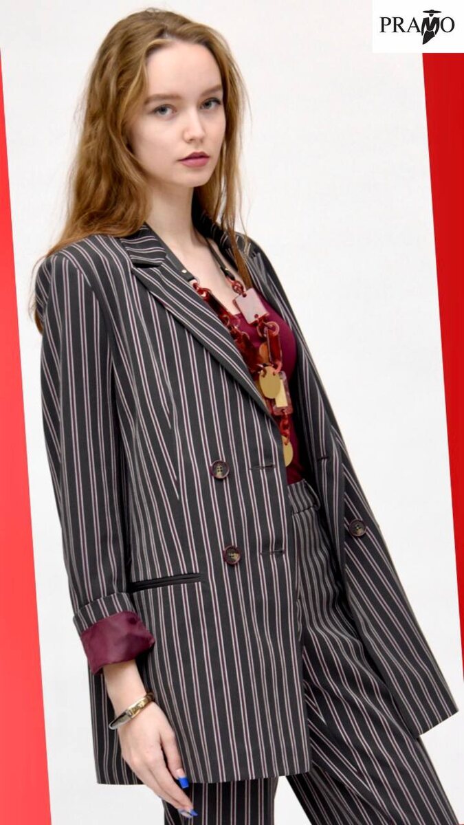 "Министерская" сине-бордовая полоска на тонкой шерсти с шелком, подсвеченная бордовой подкладкой, прямой свободный силуэт пиджака, однозначно двубортная застёжка и жесткая форма лацканов.