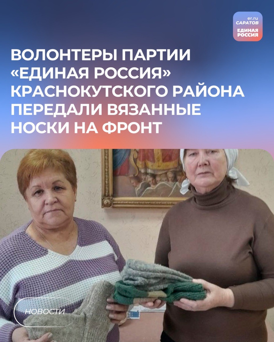🪖Активисты первичного отделения «Лавровское» Краснокутского местного отделения партии «Единая Россия» приняли участие в акции «Тепло для Героя». С начала специальной военной операции жители села Лавровка Краснокутского района активно принимают участие в сборе гуманитарной помощи. Собирают продуктовые наборы, приобретают медикаменты, теплые вещи, инструменты, все что необходимо солдатам для выполнения боевых задач. 💬«Работа Лавровского штаба по сбору гуманитарной помощи не останавливается ни на минуту. Мы плетем сети, вяжем носки, шьем теплые вещи. По просьбе наших бойцов закупаем инструменты, строительные материалы, и все что так сейчас им необходимо. Вот и сейчас старшее поколение в очередной раз присоединилось к акции «Тепло для героя». Шерстяные носки, связанные заботливыми руками, - незаменимая вещь для наших военнослужащих», - поделилась член местного политсовета, волонтер проекта «Старшее поколение» Наталья Курилович.