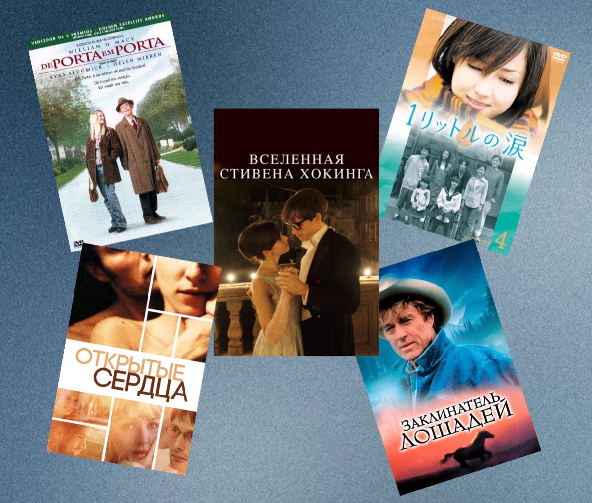 Вселенная Стивена Хокинга (The Theory of Everything), реж. Джеймс Марш, 2014. История большой любви и больших открытий. Молодой студент-физик Стивен Хокинг знакомится с будущим искусствоведом Джейн Уайльд. Стивен подает большие надежды, профессора видят в нем будущее английской космологии. Веселые свидания, прогулки с друзьями, танцы в вечерних огнях и разговоры о физике, Боге и искусстве остаются в прошлом - Хокингу ставят страшный диагноз - болезнь Лу Герига. Его жизнь может оборваться через 2 года, но это не пугает Джейн. Дверь в дверь (Door to Door), реж. Стивен Шактер, 2002. Билл Портер с детства болен церебральным параличом, но, не смотря на свое состояние, отчаянно пытается найти работу. Он убеждает менеджера взять его на стажировку в качестве коммивояжера в компанию товаров для дома. Каждая миля, пройденная им от клиента к клиенту, прокладывает незримую дорогу к их сердцам. Заклинатель лошадей (The Horse Whisperer), реж. Р. Редфорд, 1998. Во время конной прогулки с подростк