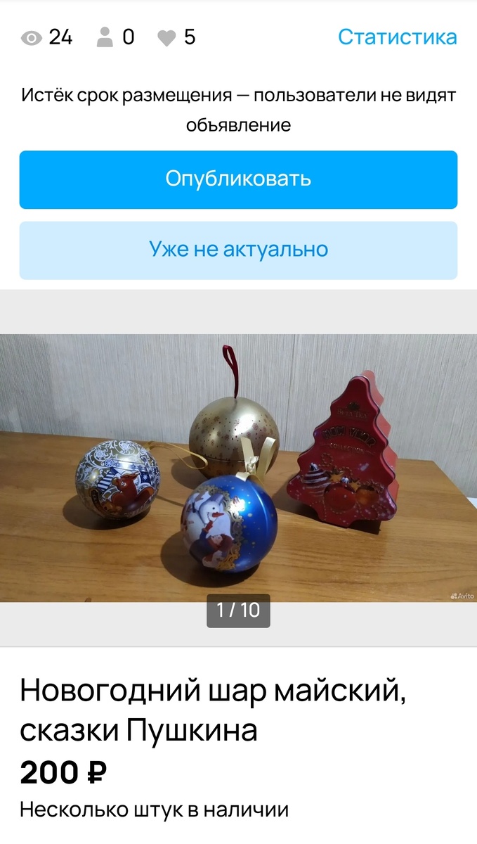 Шары новогодние, в них был чай, получены в качестве подарка лет ...цать назад. Чай давно выпит, шары почему-то уехали на антресоли к новогодней мишуре, там и лежали. Вспомнила я о них не перед Новым годом, когда доставала игрушки, а после, когда игрушки убирала. Промониторила на Авито - такие есть в продаже , значит и мне надо пробовать продавать. Название объявления взяла у коллег продавцов, добавила жестяную коробочку в форме ёлочки, над ценой задумалась, ну кто после Нового года будет это покупать? Красная цена - сто рублей , её и поставила. А заказ пришел быстро. Сначала покупатель заказала один шарик, с белочкой, из серии " Сказки Пушкина",