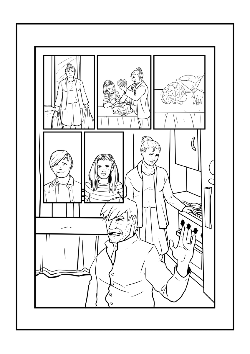 Начало: Следующий этап создания комикса - лайн. Т.е. чистовая отрисовка пока еще черно-белого комикса на основе ранее утвержденных скетчей. Казалось бы - процесс достаточно технический, никаких затыков тут не должно было быть... но они были! Проблема заключалась в баблах - это те самые пузыри в комиксах, в которых размещены диалоги. Я был спокоен в этом отношении - я понимал, что комикс - это, прежде всего, иллюстрации, а уже потом - текст. И постарался или сократить диалоги, или разнести их по разным кадрам, чтобы не случилось такого, что 2/3 кадра занимает текст. В основном все получилось как задумано - текст занимал относительно небольшое пространство в кадре, но в паре-тройке кадров, все же, текста получилось слишком много. Еще один затык с теми же баблами - Анна сперва отрисовала лайн, а потом вставляли баблы: В итоге многие изображение пришлось уменьшать, передвигать. Т.е. объем и расположение баблов нужно учитывать уже сразу при лайне. Возникли проблемы и с текстами. Насколько я