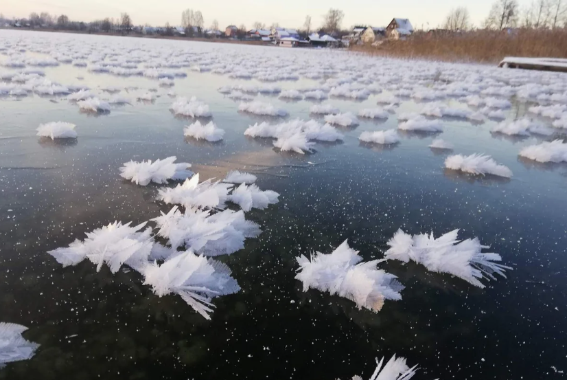На картинке выше показано, как на ровной поверхности льда появляются вот такие замечательные ледяные цветы.
