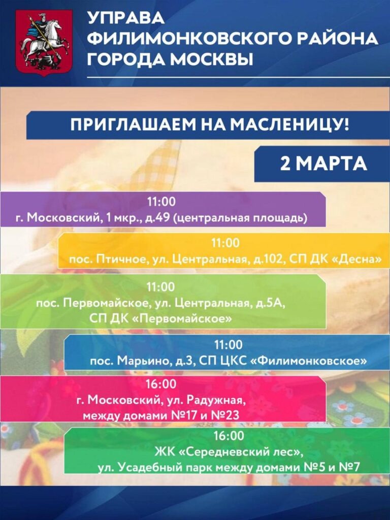 2 марта в Филимонковском районе пройдут яркие праздничные мероприятия, посвященные Масленице! 🎉 🗣 Глава муниципального округа Филимонковский Владимир Чирин: «В программе мероприятий — выступления артистов, народные игры, хороводы и мастер-классы. Традиционные гуляния пройдут в один день на нескольких площадках района. Уверен, что и взрослые, и дети отлично проведут время в атмосфере проводов зимы». Масленичные гуляния состоятся на 6 площадках района. 1 мкр., д.49 (центральная площадь) ул. Центральная, д.102, СП ДК «Десна» ул. Центральная, д.5А, СП ДК «Первомайское» д.3, СП ЦКС «Филимонковское» ул. Радужная, между домами №17 и №23 ул. Усадебный парк, между домами №5 и №7