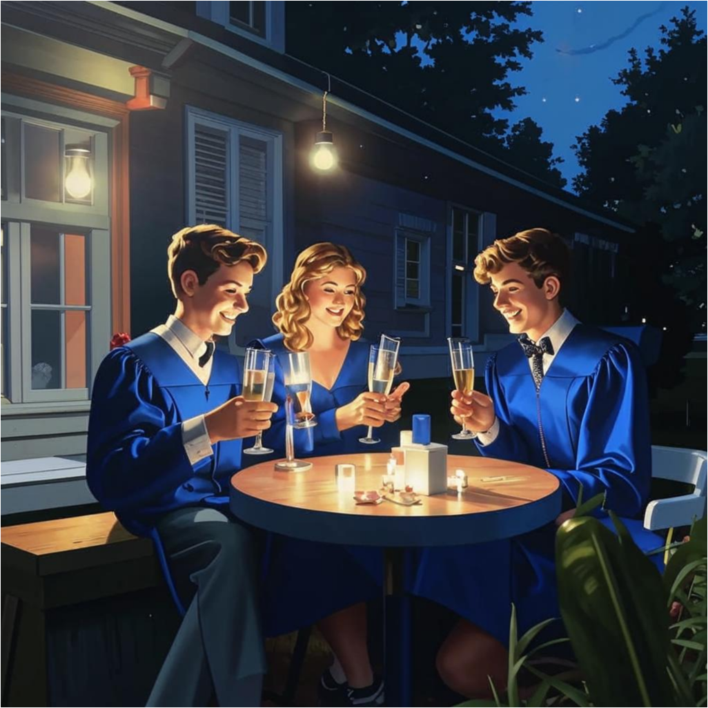 Вечер (вернее, ночь) в кафе традиционно закончилась тем, что выпускники пошли встречать рассвет. А Ксения с друзьями вернулись к школе и сидели на ее ступенях. Алексей достал из пакета бутылку с шампанским.