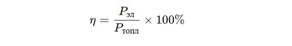 Коэффициент полезного действия (КПД) показывает, какая доля энергии, содержащейся в топливе, превращается в полезную электрическую энергию. Он рассчитывается по формуле: