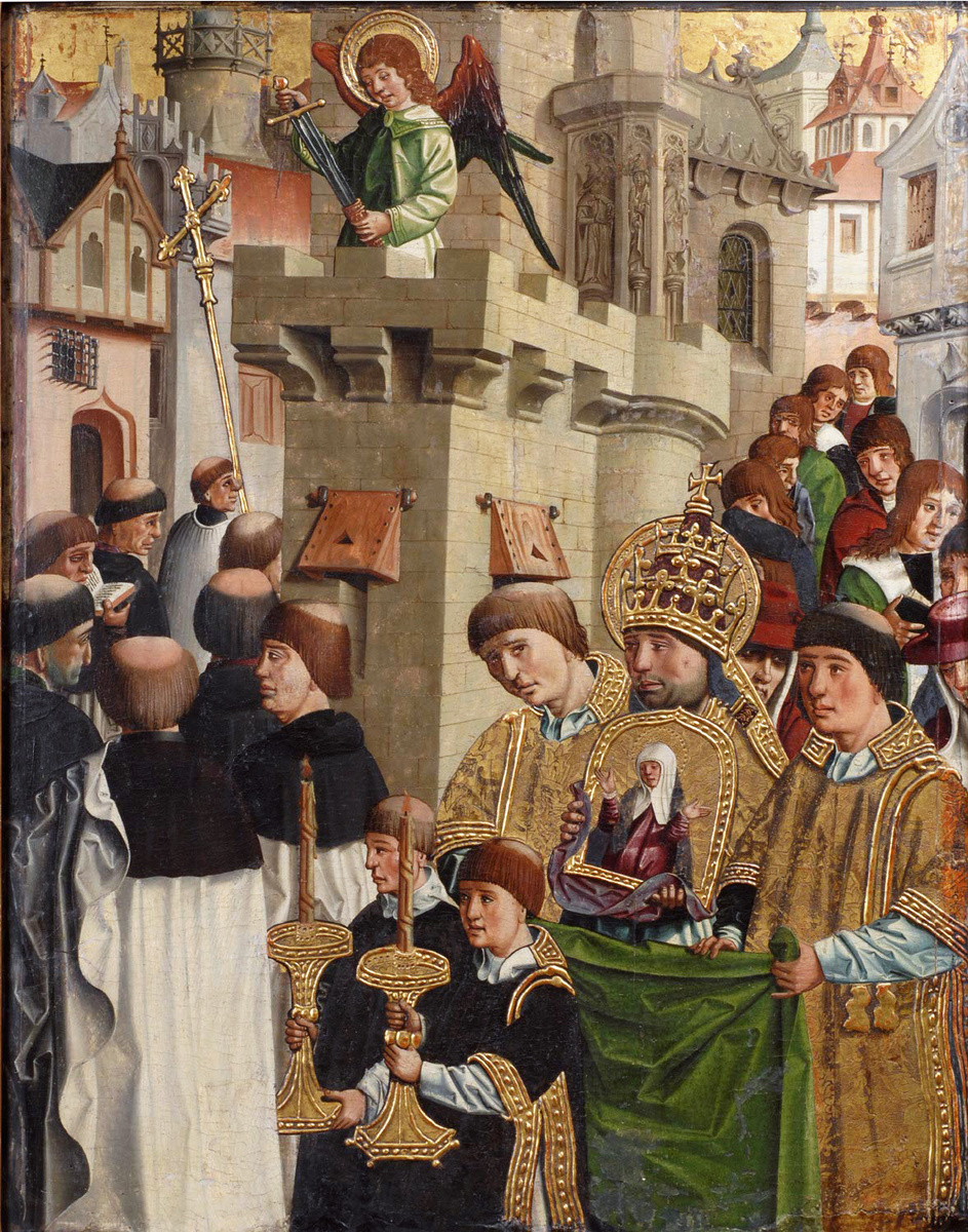 Перед нами картина неизвестного испанского художника 15\16 веков из Арагона. Castel Sant'Angelo / Замок Святого Ангела — большая башня в Риме, недалеко от собора Святого Петра. Первоначально он был построен между 134 и 139 годами н.э. в качестве гробницы римского императора Адриана. Но постепенно усыпальница была превращена в папскую крепость, чтобы обеспечить бОльшую защиту и стать личным убежищем для пап во время осады города. На этой картине изображена легенда, касающаяся нынешнего названия гробницы-крепости. Согласно ей, в 590 году нашей эры на Рим обрушилась страшная эпидемия чумы. Папа Григорий I «Великий» (понтификат 590 – 604 гг. н.э.) возглавил процессию, которая молила Бога остановить эпидемию. Когда процессия достигла мавзолея, на вершине здания появился архангел Михаил, вкладывающий свой меч в ножны в знак окончания эпидемии. В честь этого чуда здание было переименовано в Castel Sant'Angelo. На картине изображена процессия с папой Григорием I, несущим изображение Девы Мари