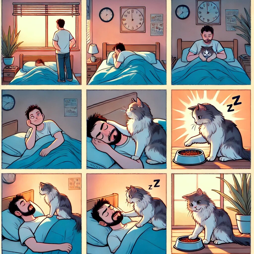1️⃣ Внутренний ритм: точность без компромиссов ⏰ 2️⃣ Не только голод: ритуалы взаимодействия 🤝 3️⃣ Контроль территории: бдительный дозор 🔍 4️⃣ Дрессировка наоборот: кто кого приручил? 🎭 5️⃣ Психологическая зависимость: страх одиночества 💔 6️⃣ Как перехитрить пушистый будильник? 🎯 7️⃣ Вывод 🎤 Кошки следуют биологическим циклам. Их тело пробуждается на рассвете — значит, пора действовать. — 🐈 "Я хищник, значит, охота начинается!" — примерно так размышляет ваш питомец, невзирая на ваши выходные. Кошки не просто требуют еду — они создают утренний ритуал. Топчутся, трутся, мурчат, устраивают концерт. — 🐾 "Я здесь, мы вместе!" — кошка напоминает о себе не только физически, но и эмоционально. Кошки патрулируют пространство, проверяют, всё ли в порядке. Спящий человек вызывает подозрение. — 🧐 "Ты дышишь? Всё в порядке?" — проверка лапой или лёгкий укус — не агрессия, а связь. Если встаёте по первому требованию — поздравляем, кошка вас воспитала. Она усвоила: "Мяукну — человек подниме