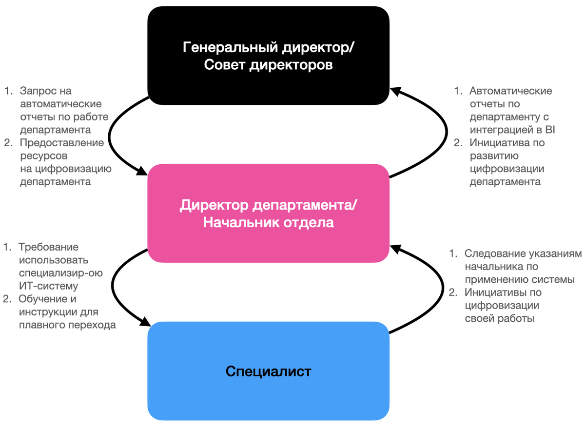 Поэтому важно серьезно подойти к этому вопросу и выстроить такую систему, при которой лучшие технологичные решения будут не только находиться, но и приживаться. Для этого я предлагаю рассмотреть схему прагматичной цифровизации компании. Почему прагматичной? Потому что в основе любой ИТ-инновации должен быть запрос от непосредственного потребителя результата этой инновации. А это значит, что мы должны сформировать такую схему работы с информационными технологиями в компании, при которой руководители функциональных подразделений сами отвечают за внедрение ИТ-решений, а руководство компании и департамент ИТ им в этом помогают и поддерживают.