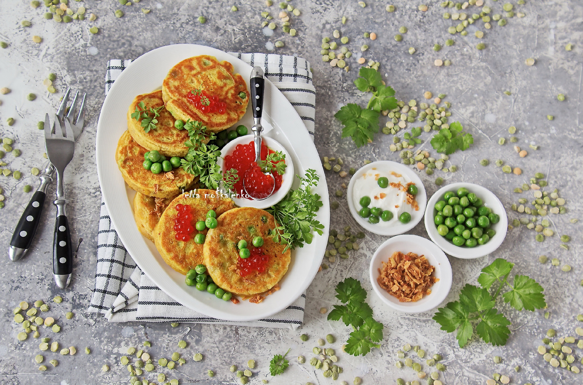 Уникальная гороховая мука по своим свойствам не требует ни яиц, ни молока – и без них оладьи пекутся без проблем, а вот добавки в оладьевое тесто могут быть совершенно разные – сладкий или острый перец, рубленая зелень, тёртая морковь, мякоть томатов, поджаренный мраморный бекон! Всё, что на ваш вкус может сочетаться с горохом. Мука гороховая – 1,5 стакана Горошек зелёный – 100 г заморозка Лук хрустящий – 50 г Карри и чили – по вкусу Соль – щепотка Масло высокоолеиновое – 50 мл + для жарки Сметана, икра и свежая зелень – для подачи ✔️гороховую муку просеять ✔️в подготовленную муку вмешать соль, хлопья чили и карри ✔️в пряную смесь добавить хрустящий жареный лук и замороженный зелёный горошек ✔️в оладьевое тесто влить 1/2 стакана горячей воды и растительное масло – перемешать. Воды может потребоваться чуть больше ✔️оладьевое гороховое тесто должно по консистенции напоминать негустую сметану ✔️ гороховые оладьи жарить на хорошо разогретой сковороде – формировать ровный кр