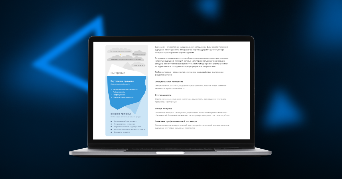 Выгорание – это состояние эмоционального истощения и физического утомления, ощущение опустошенности и безразличия к происходящему на работе, потеря интереса и разочарование в происходящем. Сотрудники, сталкивающиеся с подобным состоянием, могут снижать продуктивность, допускать больше ошибок в работе, демонстрировать раздражительность, апатию и цинизм по отношению к окружающим, уходить от контактов с коллегами. Выгорание негативно влияет на эффективность сотрудников и требует регулярной профилактики. Любое выгорание – это результат сочетания и взаимодействия внутренних и внешних факторов. Не всегда выгорание бывает очевидно самому человеку, благодаря опроснику можно вовремя заметить тревожные признаки и изменить стратегию действий: в описательном отчете «Оценка выгорания» (открыть) содержится информация о выраженности выгорания и о том, как именно это проявляется в поведении. Кроме этого, мы анализируем особенности личностного стиля, который может создавать риски возникновения нересурс
