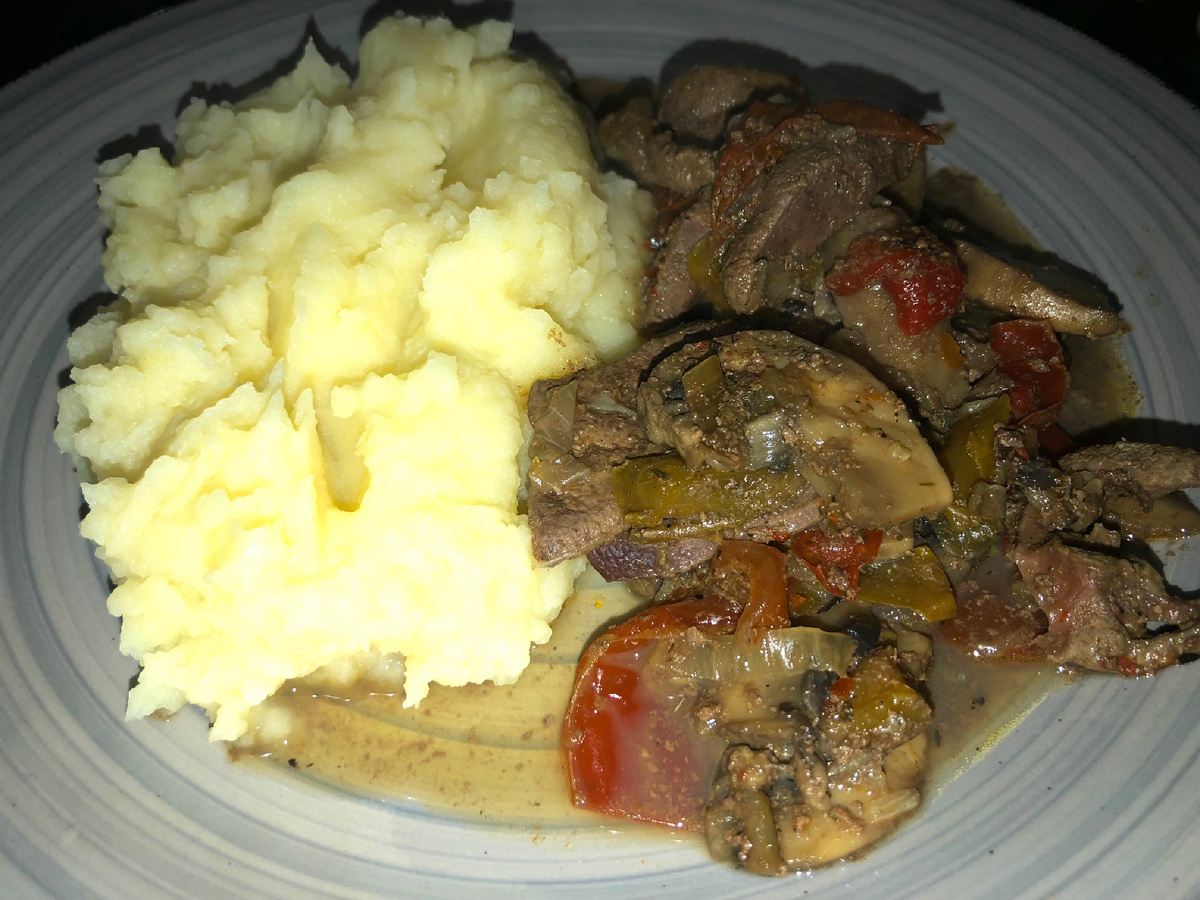 Идея вкусного ужина: свиная печень с болгарским перцем и грибами