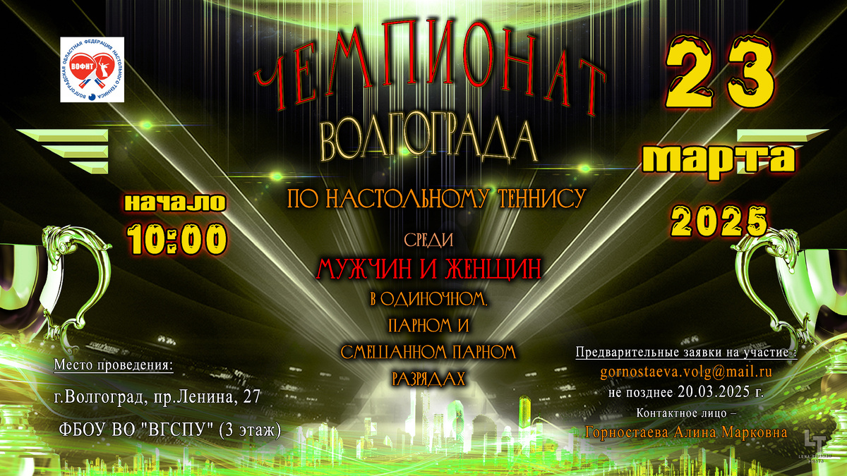 Доброго времени суток, уважаемые любители настольного тенниса!☀ В воскресенье, 23 марта 2025 года, Волгоградская областная Федерация настольного тенниса (ВОФНТ) приглашает всех желающих спортсменов г.Волгограда принять участие в Чемпионате Волгограда по настольному теннису среди мужчин и женщин! Соревнования проводятся в одиночном, парном и смешанном парном разрядах. К участию допускаются мужчины и женщины без ограничений по возрасту и спортивному разряду. Принадлежность спортсмена к городу Волгоград определяется регистрацией по месту жительства или по принадлежности спортсмена к физкультурно-спортивной организации. Место проведения: ВГСПУ, 3 этаж (большой зал) Спорткомплекса (г. Волгоград, пр. им. В.И. Ленина, 27). ❗10:00 – Начало соревнований.❗ Разминка, прием заявок за час до начала. 🥇🥈🥉Победители и призеры награждаются медалями и грамотами. Предварительные заявки на участие в соревнованиях направляются в электронном виде в текстовом формате по адресу электронной почты: gornost