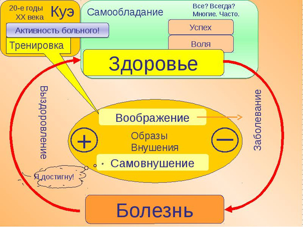 И далее Куэ пришел к выводу, что воображение людей, страждущих исцеления от душевного или физического недуга, нужно правильно направлять, причем делать это человек может сам через самовнушение.