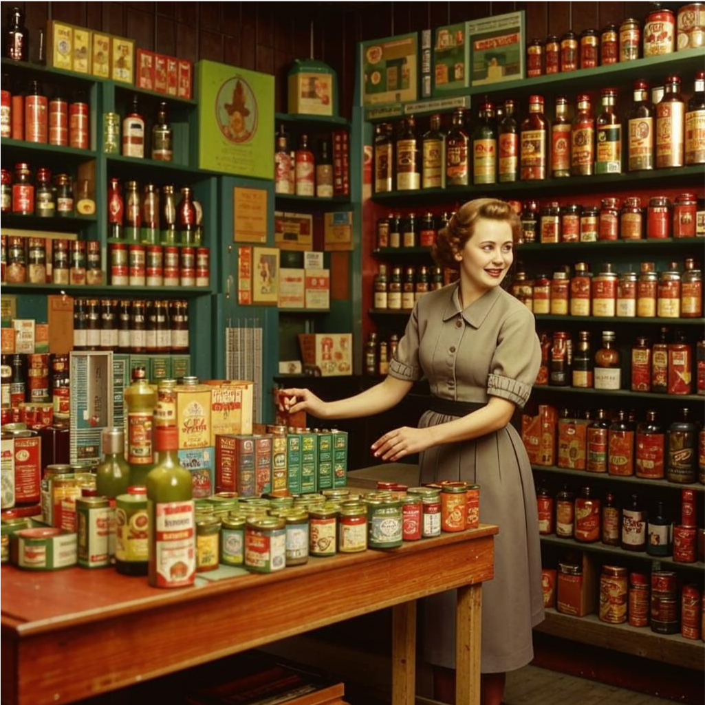На самых верхних полках в магазине стояли консервы. Почему-то много было стеклянных баночек с консервами детского питания, разные овощные и фруктовые пюре. Не помню, чтобы их кто-то покупал, однажды слышал, что они давно просрочены и только украшали полки. Сгущённое молоко почти не покупали, это потом оно стало дефицитом. Было много овощных консервов в стеклянных банках: соленые огурцы, помидоры, салаты, икра. В то время домашнее консервирование у нас в селе только зарождалось, помню как моя мама впервые где-то купила по знакомству десять крышечек и у кого-то взяла взаймы ключ для закатывания, это было где-то в 1962 году. Ассортимент рыбных консервов был большим. Однажды даже завезли крупную партию консервов из крабов, омаров, кальмаров. Эти консервы лежали очень долго, несколько лет, их никто не покупал, дальнейшая судьба их мне неизвестна. Мне тогда очень нравилась “Камбала в томате”. Из рыбных консервов только “Бычки в томате” нашего Бердянского рыбзавода продавались в стеклянных банках по 300 грамм. Сейчас таких банок давно нет. Они похожие на современные банки 0,5 литра, только низенькие. Солёную сельдь продавали прямо из бочки с рассолом. Её тоже заворачивали в оберточную бумагу, в несколько слоев, она просачивалась, неприятное было зрелище. А нести домой её было ещё неприятнее, она могла испачкать как другие продукты в сумке или авоське, так и саму сумку, а также одежду, обувь.