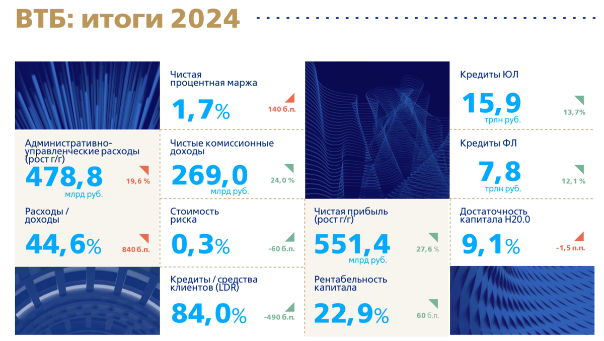 ВТБ отчитался за 2024 г. — чистая процентная маржа упала до 1,7%, но роспуск резервов и прочие опер. доходы помогли побить рекорд по прибыли