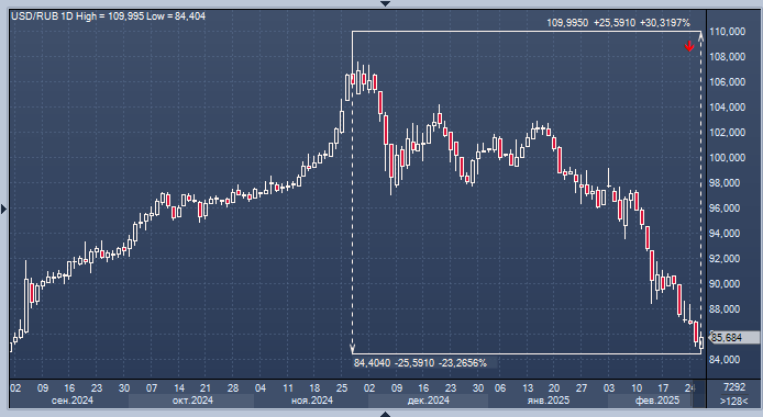 Рубль укрепляется из-за геополитики и снижения спроса на валюту, пока сложно оценить устойчивость процесса - ЦБ РФ Курс доллара к рублю расчётный, фьючерс, вечный фьючерс и межбанк. Курс евро к рублю расчётный, фьючерс, вечный фьючерс и межбанк. Курс юаня к рублю биржевой, фьючерс, вечный фьючерс и межбанк. Укрепление рубля происходит из-за геополитических событий и сезонного снижения спроса на валюту со стороны импортёров. Однако пока сложно предсказать, насколько стабильным будет этот процесс и как он повлияет на цены. Об этом говорится в сообщении Центрального банка России по итогам заседания совета директоров в феврале. «Участники согласились, что пока сложно оценить, насколько устойчивым будет укрепление рубля, наблюдаемое в последние недели, и как оно повлияет на цены. Укрепление рубля было связано как с реакцией рынков на геополитические события, так и с сезонным снижением спроса на иностранную валюту со стороны импортеров», — отмечает Банк России. В Центральном банке отмечают,