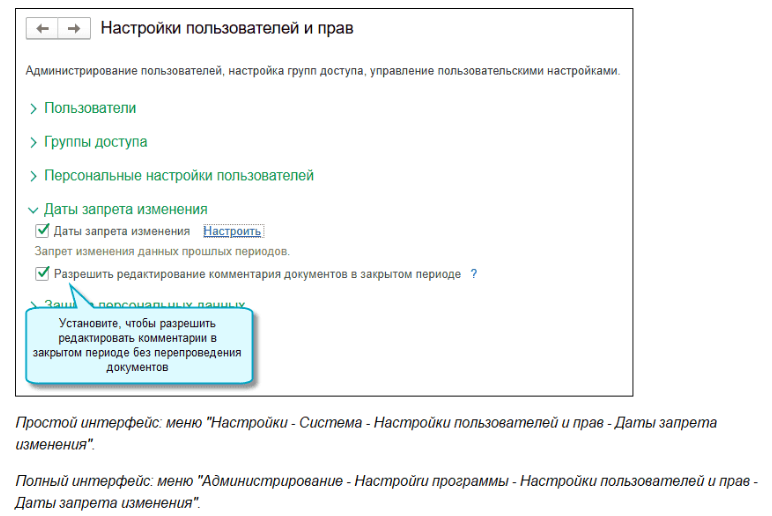 Добавлена возможность редактировать комментарии в документах, проведенных в закрытом периоде. Документы при этом не перепроводятся. Чтобы воспользоваться, главному бухгалтеру или другому сотруднику, который занимается администрированием прав, потребуется выполнить следующую настройку Вы всегда можете заказать услуги по 1с, а также приобрести, обновить программы 1С с помощью наших специалистов :