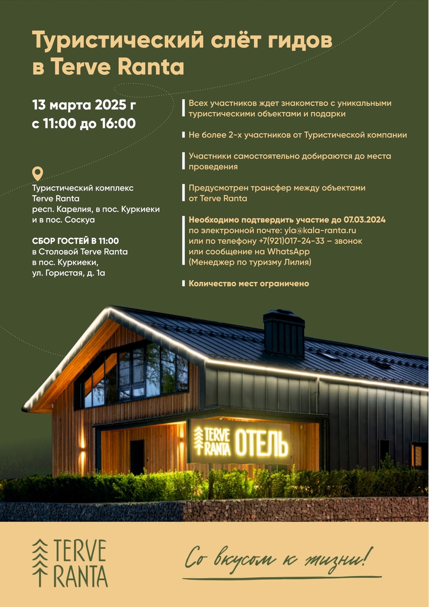13 марта с 11:00 до 16:00 будет организована программа знакомства со всеми объектами комплекса: столовой, отелем у водопада, мини отелем, коттеджами и кафе. Кроме того, в рамках мероприятия пройдет кофе-брейк с дегустацией рыбной продукции Кала Ранта и традиционный карельский обед в нашей столовой. Обратите внимание, что от каждой компании может принять участие не более двух человек. Все участники самостоятельно добираются до места проведения мероприятия. Место проведения: Республика Карелия, поселок Куркиеки, улица Гористая, дом 1а. Дата и время: 13 марта 2025 года, с 11:00 до 16:00. Количество мест ограничено! Ждем вас в туристическом комплексе Терве Ранта! Гостиничный и туристический комплекс Терве Ранта в Карелии