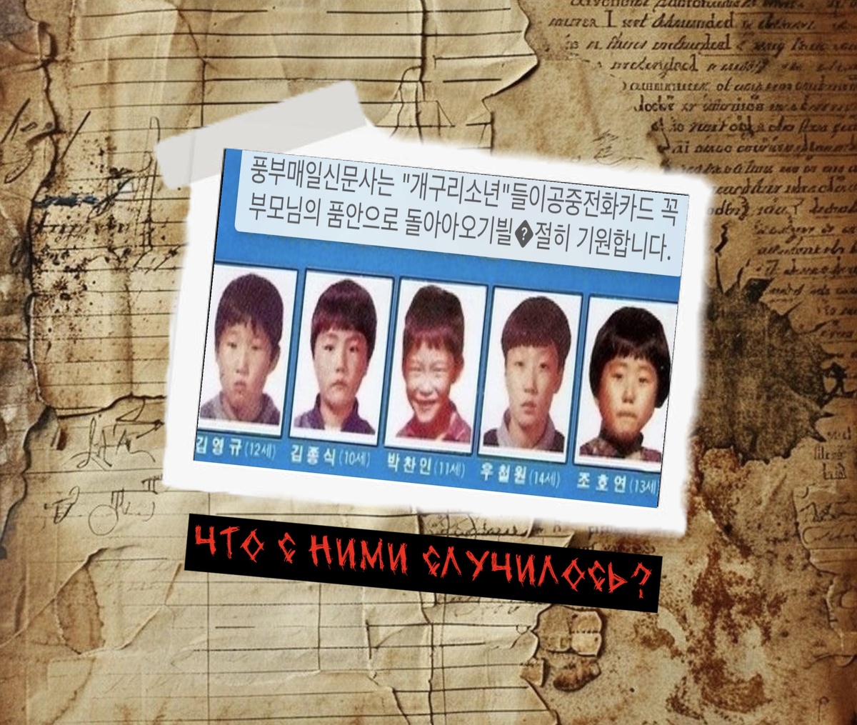 Их прозвали "пятеро мушкетеров". Маленькие мальчики в возрасте от 10 до 14 лет были неразлучны с детства, жили по соседству, ходили друг к другу в гости. 26 марта 1991 года был особым днем для всей станы. Впервые за 30 лет в Корее проводились первые демократические президентские выборы и всем детям и взрослым дали выходной. Поэтому с самого утра Джо Хойон, Ву Чульвон, Ким Джонсик, Ким Енгю и Пак Чанин проводили время вместе на заднем дворе дома одного из мальчиков. Соседи пожаловались, что их игры слишком шумные и попросили ребят отойти подальше от домов, что мальчики и сделали.