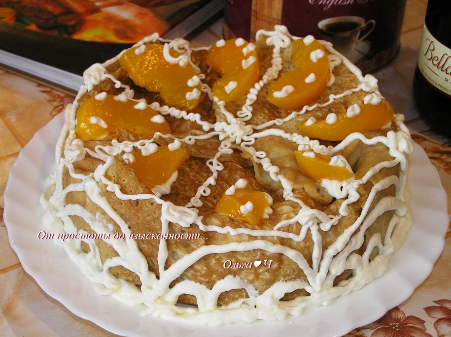 2 половинки консервированных персиков Приготовление: Половину испеченных блинчиков уложите в разъемную форму для выпечки так, чтобы свисали края. Поверх уложенных блинчиков положите еще один блин на дно формы.