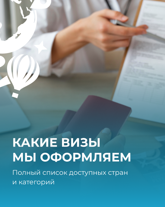 Мы помогаем вам путешествовать по всему миру, независимо от цели поездки. Наши эксперты возьмут на себя весь процесс оформления виз, чтобы вы могли сосредоточиться на планировании отдыха или деловых встреч. Популярные категории виз: 1. Туристические визы Для тех, кто мечтает увидеть мир: отдых на Мальдивах, прогулки по Парижу или дайвинг в Таиланде. 2. Деловые визы Визы для бизнесменов, участвующих в конференциях, встречах и других деловых мероприятиях. 3. Студенческие визы Помогаем студентам, которые хотят получить образование в лучших университетах мира, таких как США, Великобритания или Германия. 4. Рабочие визы Для тех, кто планирует официальное трудоустройство за границей, включая рабочие контракты в Европе и Азии. 5. Транзитные визы Если ваш маршрут проходит через страны, где требуется транзитная виза. 6. Визы для лечения Оформление виз для поездки на лечение в ведущие клиники мира, включая Германию и Израиль. Список стран, с которыми мы работаем: • Европа: Германия, Франция, Ита