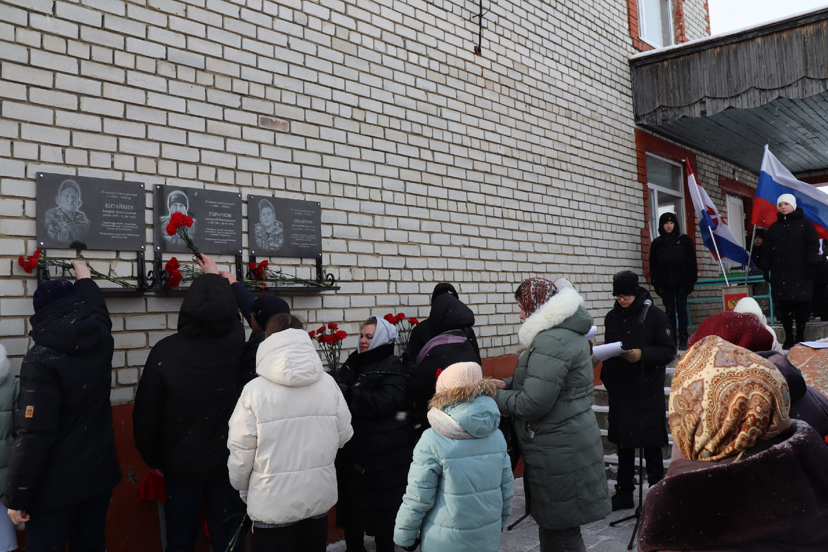 В понедельник, 24 февраля, жители Баева вновь собрались в центре, чтобы отдать дань памяти уроженцам села, погибшим в ходе проведения СВО. Здесь состоялось торжественное открытие мемориальных досок на фасаде школы в честь Николая Валерьевича Китайкина, которого провожали в последний путь в конце января, Андрея Анатольевича Китайкина и Анатолия Викторовича Горбунова, с которыми баевцы простились в прошлом году. На торжественном митинге присутствовали и.о. начальника управления образования Т.В. Суняйкина, муниципальный координатор фонда «Защитники Отечества» Н.Н. Коробкова, заместитель главы Баевского сельского поселения Е.В. Китайкина, настоятель храма Пресвятой Богородицы о. Илья (Абудеев), родители и бабушка Николая - Т.Н. и В.С. Китайкины, Н.С. Литюшкина, мама и брат Анатолия - З.П. и А.В. Горбуновы, вдова Андрея – О.В. Китайкина и сестра С.А. Нажалкина, дети героев и многочисленные родственники трех семей, друзья погибших. Многие жители села пришли с цветами. Ведущие мероприятия – у