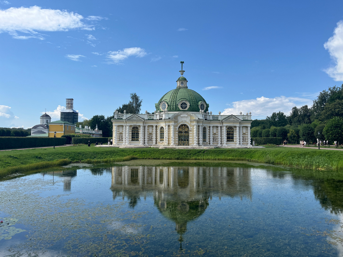 Самое примечательное сооружение Кусково - Павильон Грот с его чудовой "морской" отделкой, красоту которой трудно передать словами. Другие статьи о Москве: Зарисовки из разных мест ВДНХ Третьяковская галерея Парк Кусково Павильон Грот Палац Кусково Костёл Непорочного Зачатия ГУМ Старый Арбат Китай-Город Патриаршие пруды Хамовники Парк Горького Ярославский вокзал Московское метро 1. Общий вид на Грот из-за небольшого ставка: 2. Само здание было построено в 1756-1761 годах по проекту Фёдора Аргунова, крепостного Шереметевых. История умалчивает, каким образом и где он выучился архитектуре, но в целом павильон в популярном тогда стиле рококо смотрится здорово. Скорее всего, графы послали его учиться в Петербург или одну из европейских стран, заметив его способности к черчению и рисованию. Как минимум один подобный пример хорошо известен: архитектор Казанского собора в Петербурге Андрей Воронихин вышел из крепостных крестьян семьи уральских промышленников Строгановых. 3. В XVIII столетии "гр