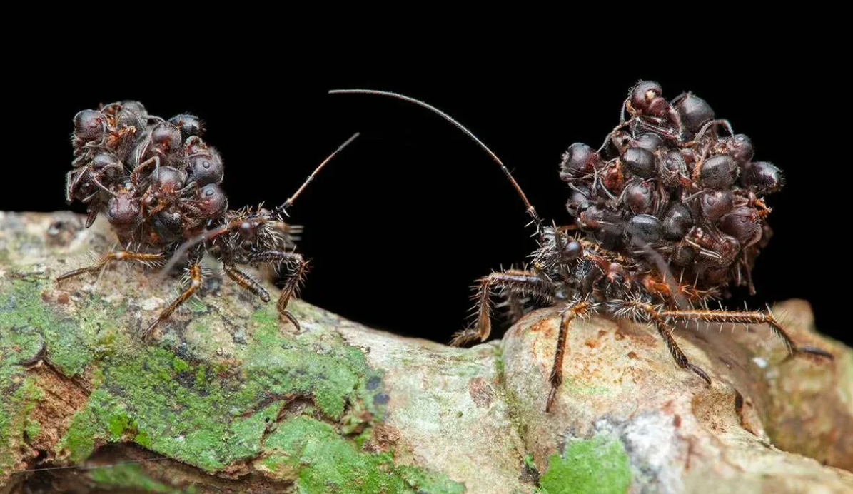 Но дело не ограничивается одним убийством. Клоп заботливо прикрепляет иссушённый труп к себе на спину. Муравей становится чем-то вроде «кладбищенского щита» — со временем на клопе скапливается целая груда тел, которые выглядят устрашающе даже в миниатюре.
