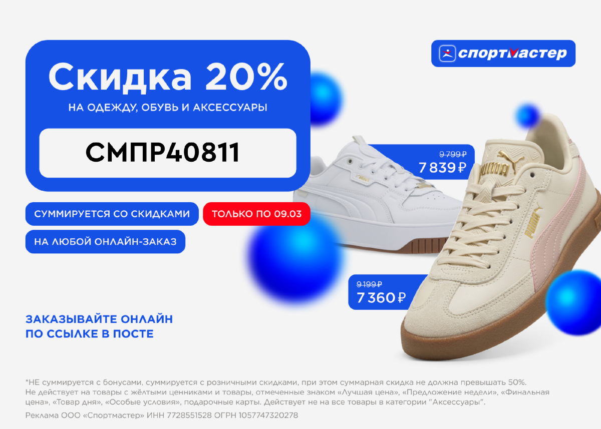 🔥 До 9 марта действует промокод на скидку 20% на одежду, обувь и аксессуары СМПР40811