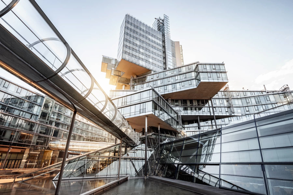Германия не только экономический и промышленный лидер Европы, но еще и лидер в применении передовых строительных технологий. Одна из часто используемых колонны в гибридных каркасах является, как вы поняли, – трубобетон. Здание Norddeutsche Landesbank (Nord/LB) в Ганновере, открытое в 2002 году, является выдающимся примером современной архитектуры, сочетающей инновационный дизайн и передовые технические решения. Здание "Северонемецкого Земельного банка" было спроектировано необычной командой архитекторов, состоящей из отца и сына — Гюнтера и Стефана Бенишами. Основа банка — это платформа, с которой на семьдесят метров возвышается семнадцатиэтажное здание. Каждый этаж этого здания разделён на горизонтальные блоки, установленные под разными углами. Проект, разработанный архитектурным бюро Behnisch, Behnisch & Partner, представляет собой сочетание строгой прямоугольной блоковой застройки и динамичного центрального башенного элемента. Нижняя часть здания образует прямоугольный блок размер