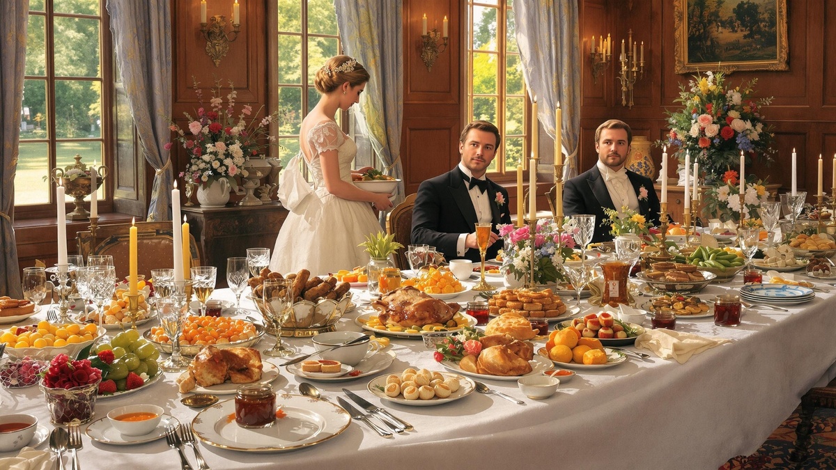 Вы когда-нибудь задумывались, как питались дворяне в русских усадьбах XIX века? Это были не просто трапезы — целые ритуалы, полные изысков, традиций и роскоши, которые могли длиться до 5–6 часов. Но за пышными столами скрывались строгий этикет, кухонные трудности и даже переедание. Прочитайте, чтобы узнать, чем угощали, как сервировали и почему эти обеды стали частью русской культуры. Обеды в русских усадьбах были настоящим пиршеством. В XIX веке столы ломились от блюд, вдохновлённых русской кухней и европейскими веяниями. Вино, наливки, мёд и самогон сопровождали трапезу. Один обед мог включать до 15–20 блюд, что подчёркивало богатство хозяев. Стол в усадьбе был произведением искусства. Его накрывали с исключительной тщательностью. Тарелки, серебряные ложки, хрустальные бокалы сверкали на белых льняных скатертях с вышивкой. Цветы, свечи, серебряные подносы украшали стол. Еда подавалась в строгом порядке: сначала холодные закуски, затем горячие супы, мясо, рыба, десерты. Всё сопровожда