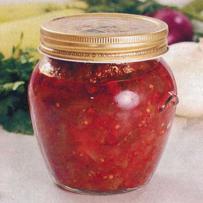 - Подготовленные продукты сложить в глубокую емкость, залить овощи кипящим соусом, тщательно перемешать и проварить овощную массу в течение 45 мин.