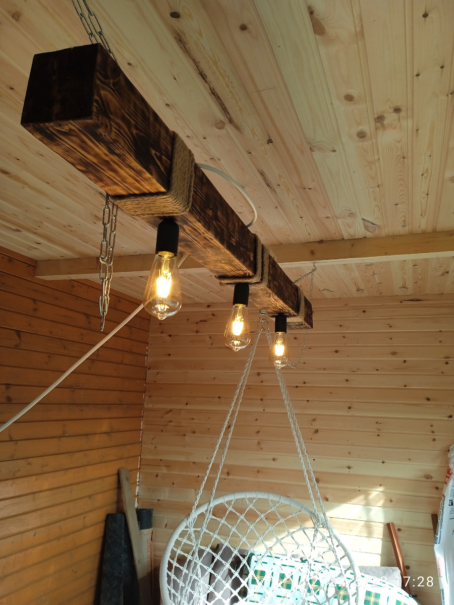 Дело было весной 2022 года, в период отделки веранды на даче. Хотелось что-то необычного и началось все с люстры, причем из натурального дерева. Поиски на просторах интернета, просмотр разных дизайнов и мониторинг стоимости того, чего хотелось привело меня в состояние - блин, это же дорого, расходники стоят "копейки", а просят за этого на мой взгляд много слишком денег (замечу, что речь не о резных потолочных люстрах, руки высококлассного мастера, а просто "кусок дерева", с джутовым канатом (веревкой), несколькими светодиодными лампами в стиле "ретро" и брашированием (обжигом)). Конечно понимаю, что кроме материалов + работа и некоторые другие издержки включены в стоимость, но у меня просто конкретно включилась "жаба", а может еще и желание - дай сам попробую, материал есть, инструменты есть, неужели у меня руки из....(не из плеч :-)...)не хватало только джутового каната, ламп, патронов к ним, крепежа будущего изделия к потолку. В ближайший день отправился в магазин, докупил то, чего н