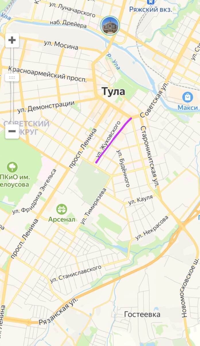 Сейчас Жуковского (Остроженская) берёт начало от улицы Советской и упирается в улицу Льва Толстого.