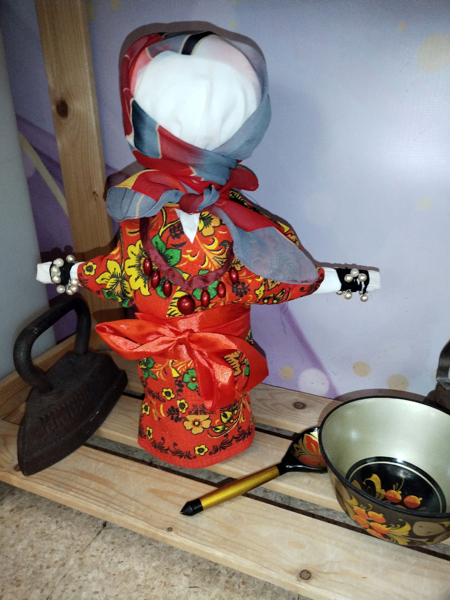 А тут сколько всего! И бусы, и фартук расписной, и монетки по подолу для обережного звона... А блин-то какой аппетитный! Между прочим, он сделан в наиактуальнейшей нынче технике "апсайклинг". Если простыми словами, то слово это значит "вторая жизнь вещей". Этот блин - из полиэтиленовых пакетов!