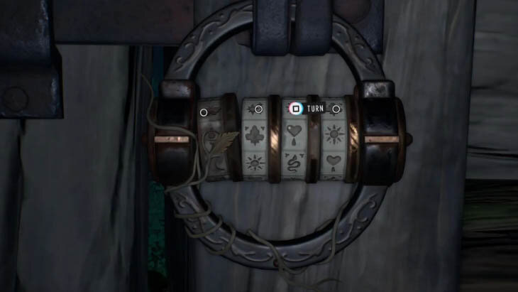 Для открытия замка требуется правильно расположить четыре символа. Первый символ уже зафиксирован и является верным. На одной из балок хижины игроки найдут бумагу, прикрепленную ножом, которая указывает расположение всех символов. При этом в хижине намеренно размещены ложные подсказки.