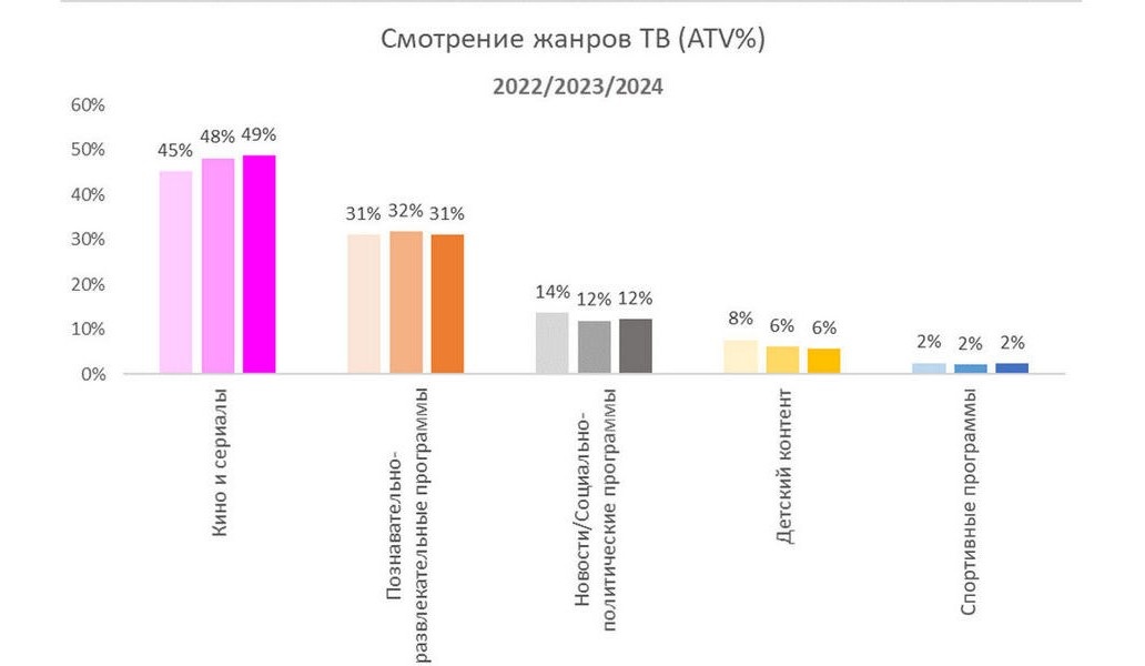 Оператор «Триколор» на форуме CSTB представил результаты исследования зрительских предпочтений в 2024 году. Согласно телеизмерениям, спрос на киносериальный жанр ТВ в 2024 году продолжил расти, достигнув пандемийной отметки 49 %, когда клиенты были вынуждены проводить большую часть времени в изоляции. Данные подготовлены оператором на основе исследований, проведенных одним из крупнейших российских телеизмерителей – «Агентством 2». Жанровые предпочтения Лидерство киносериального жанра на ТВ не ново, но впервые интерес зрителей сравнялся с пандемийным значением – 49 %, даже несмотря на дефицит голливудского контента. Распределение интереса в остальных жанрах по итогам года осталось без изменений. Вторыми по популярности остаются развлекательные и познавательные программы, на которые приходится 31 % смотрения. Новостная и общественная тематика занимает долю 12 %. Следующие места в рейтинге пришлись на детский (6 %) и спортивный (2 %) контент. В разрезе регионального телесмотрения Мультипл