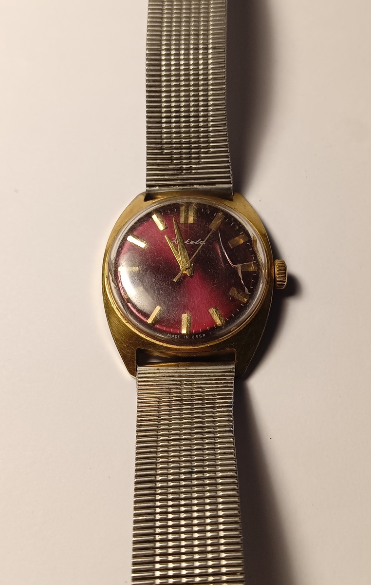 Доброго времени суток! В ремонт принесли Ракету - классика из СССР, в позолоченном корпусе, да ещё и с красным циферблатом. Владелец попросил стекло заменить, да и сделать профилактику, вроде ходят не точно и останавливаются. Видно что часы уже вскрывались, да и ничего удивительного за столько то лет. Снял крышку, крепежное кольцо немножко развалилось, то ли от времени, то ли от прошлых вмешательств. На крышке стоит дата прошлого ремонта - 1989 год и инициал мастера. Снял стрелки и циферблат. Все детали в мойку. Хотел было барабан заменить, на нём были следы ржавчины, но вроде отмылся нормально, решил оставить. Собрал, ходят отлично. Установил цифер и стрелки. Красивый цвет. Теперь таймграфер нам показал что выкачку нужно подправить. Вот теперь порядок. В вертикальном положении показания практически не изменились! Вверх циферблатом также, отклонение минимально и амплитуда стабильна во всех положениях, честно не очень часто в старых часах такие показатели. Ракета меня в очередной раз