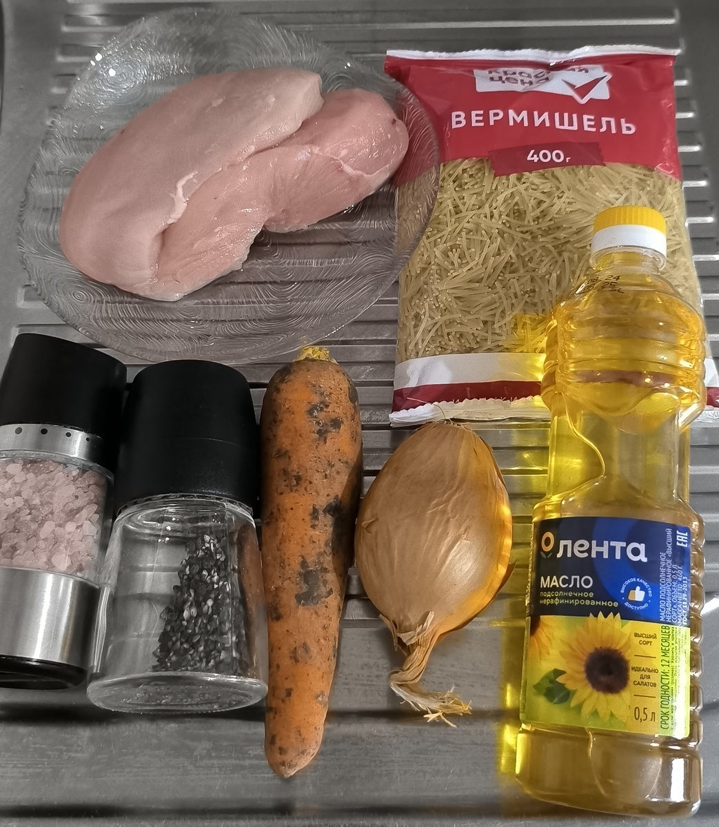 Все же знают что такое жареные макароны? Для многих это блюдо из детства, которое готовила мама или бабушка. Очень просто и быстро готовится, всегда выручает при острой нехватке времени. Сегодня пойдем от обратного и немного усложним блюдо. Добавим мясо и немного овощей, и приготовим очень вкусный, а главное быстрый ужин в одной сковороде! Ингредиенты: - вермишель «Паутинка» 300 грамм - куриное филе 300 грамм - лук 1 штука. - морковь 1 штука - подсолнечное масло 2 столовые ложки - соль и черный молотый перец по вкусу. Обжарить на сковороде вермишель до румяного цвета в 1 столовой ложке растительного масла. Паутинку переложить в миску. Лук почистить и нарезать небольшим кубиком. Морковь почистить и натереть на мелкой терке. Куриное филе нарезать на небольшие кусочки. Обжарить курицу в хорошо разогретом растительном масле до золотистого цвета. Добавить лук, морковь и обжаривать все вместе, постоянно помешивая, около 5 минут. Добавить соль и перец. Тщательно перемешать